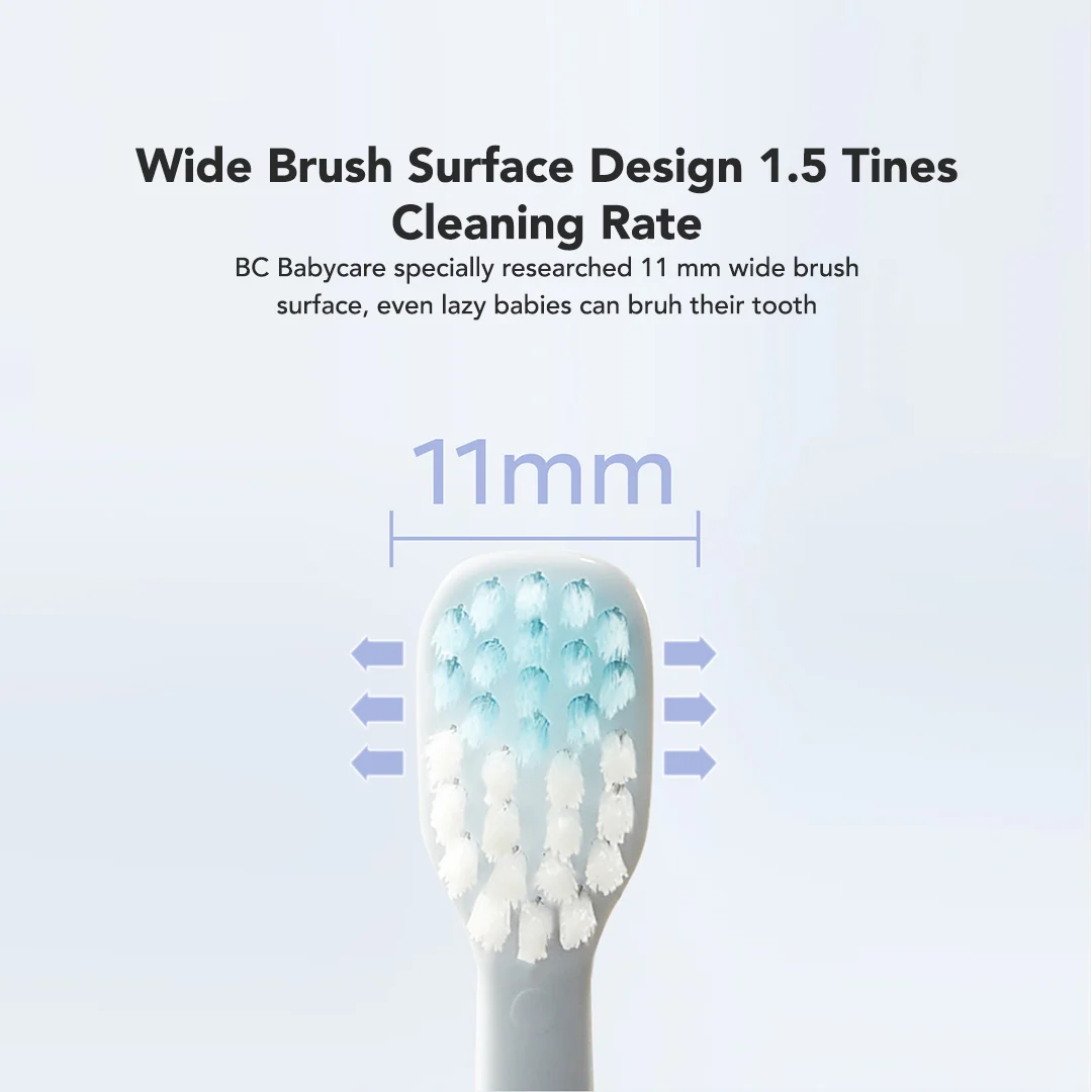 Desain lebar permukaan sikat 11mm yang ampuh untuk membersihkan 1,5x gigi anak lebih bersih daripada sikat gigi anak pada umumnya.